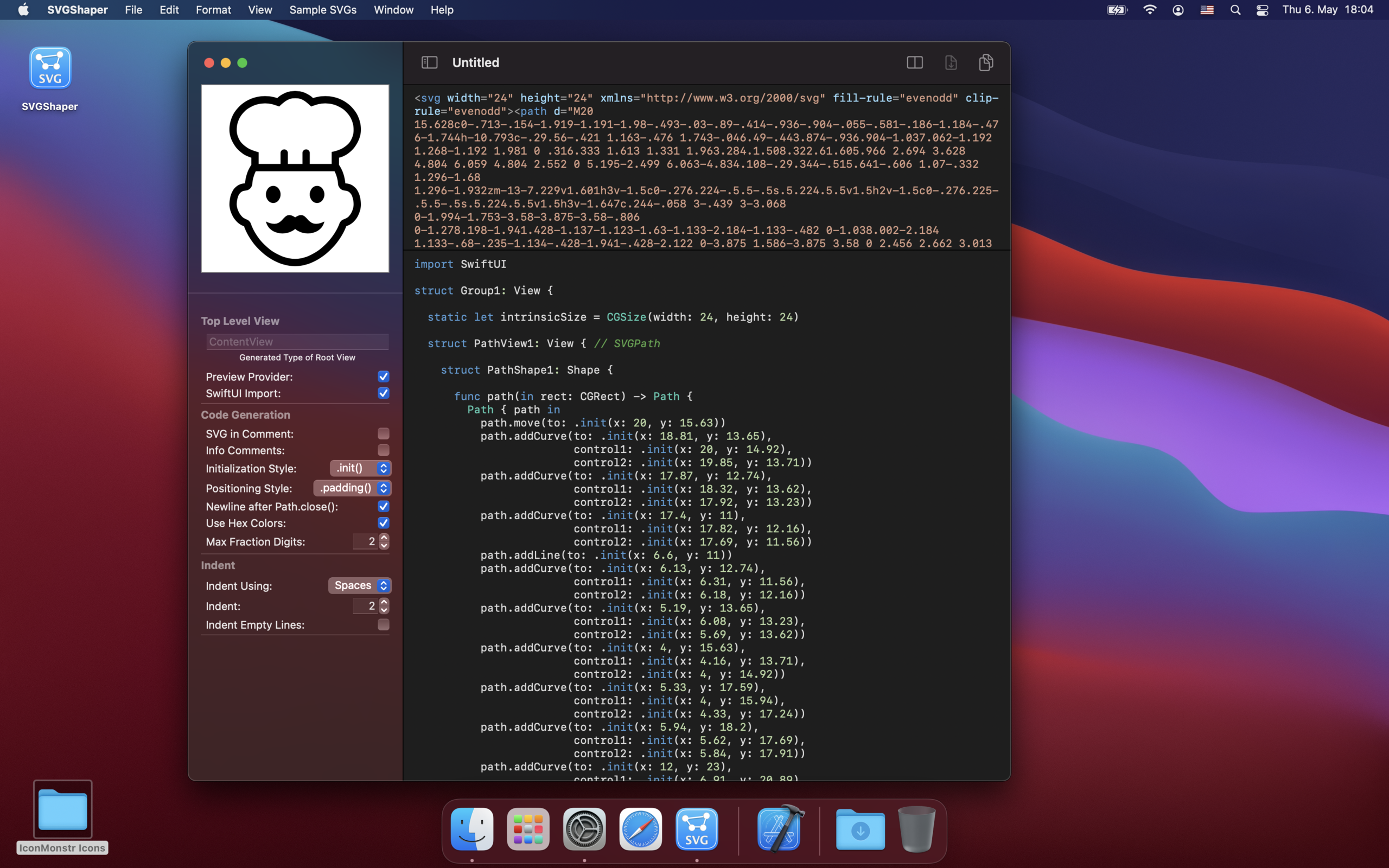 The app also tries to convert the overall structure of the SVG into SwiftUI “Views”. Given that the SwiftUI graphics model is different to SVG’s, the quality of the generated code depends a lot on the actual SVG and features used.