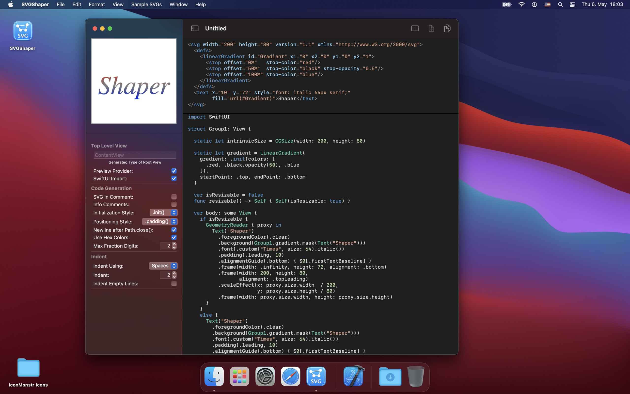 SVG Shaper for SwiftUI is a little macOS application that accepts images in the Scalable Vector Graphics (SVG) format (SVG) and converts those into SwiftUI source code. Got an SVG icon from your designer? Use the contained shapes directly within your SwiftUI views.